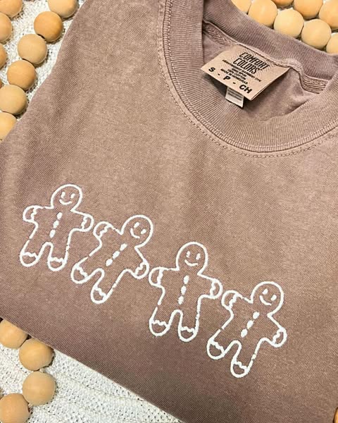 Sweeten up your holiday style with this Comfort Colors Gingerbread Shirt. Featuring four adorable gingerbread cookies embroidered across the chest, it’s the perfect mix of festive and cozy for the holiday season.